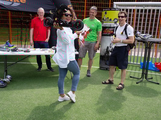 Für unser geliebtes Skifahren fehlte leider der Schnee. Aber nicht nur Wort und Begeisterung mussten dafür herhalten. Mit Herrn Nasikowski war ein Trainer vorhanden, der die neue Sportart Skiken vorstellen sollte. Skiken ist etwas für die ganz Wilden, die auch im Sommer, das Gefühl der Bretter unter den Füßen brauchen. Gefahren wird auf einer Art Rollschuh, der zwei große luftgefüllte Räder hat und hinten mit einer Bremse versehen ist. Man ahnt es schon, gebremst wird durch Gewichtsverlagerung nach hinten. Da das Ganze ziemlich hoch wird, sind auch die benötigten Stöcke von beeindruckender Länge und sie werden für einen kräftigen Vortrieb auch dringend gebraucht. - Leider konnte man auf unserem Stand das Ganze nur ansehen und nicht ausprobieren, da zur Schonung des hervorragenden Kunstrasens die Benutzung der Stöcke nicht genehmigt war. - Also weder Schnee noch Skiken.