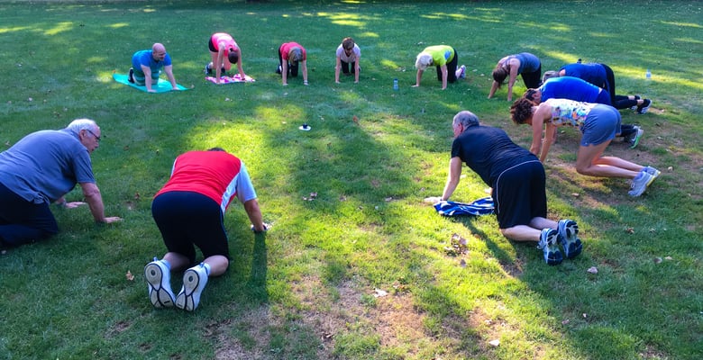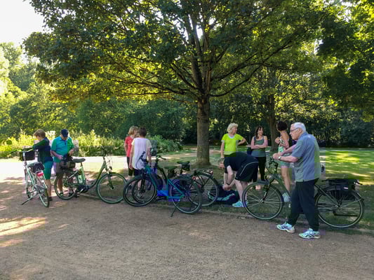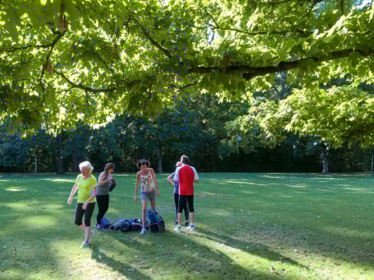 Nach ein paar Aufwärmrunden ging es dann gleich los. Esther integrierte einen vorbei kommenden Jogger gleich in die Gruppe und der machte auch sofort mit viel Freude eifrig mit.