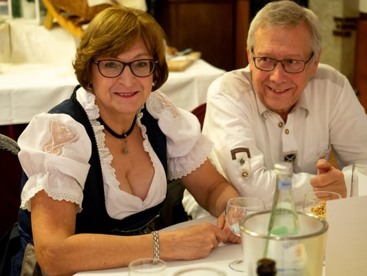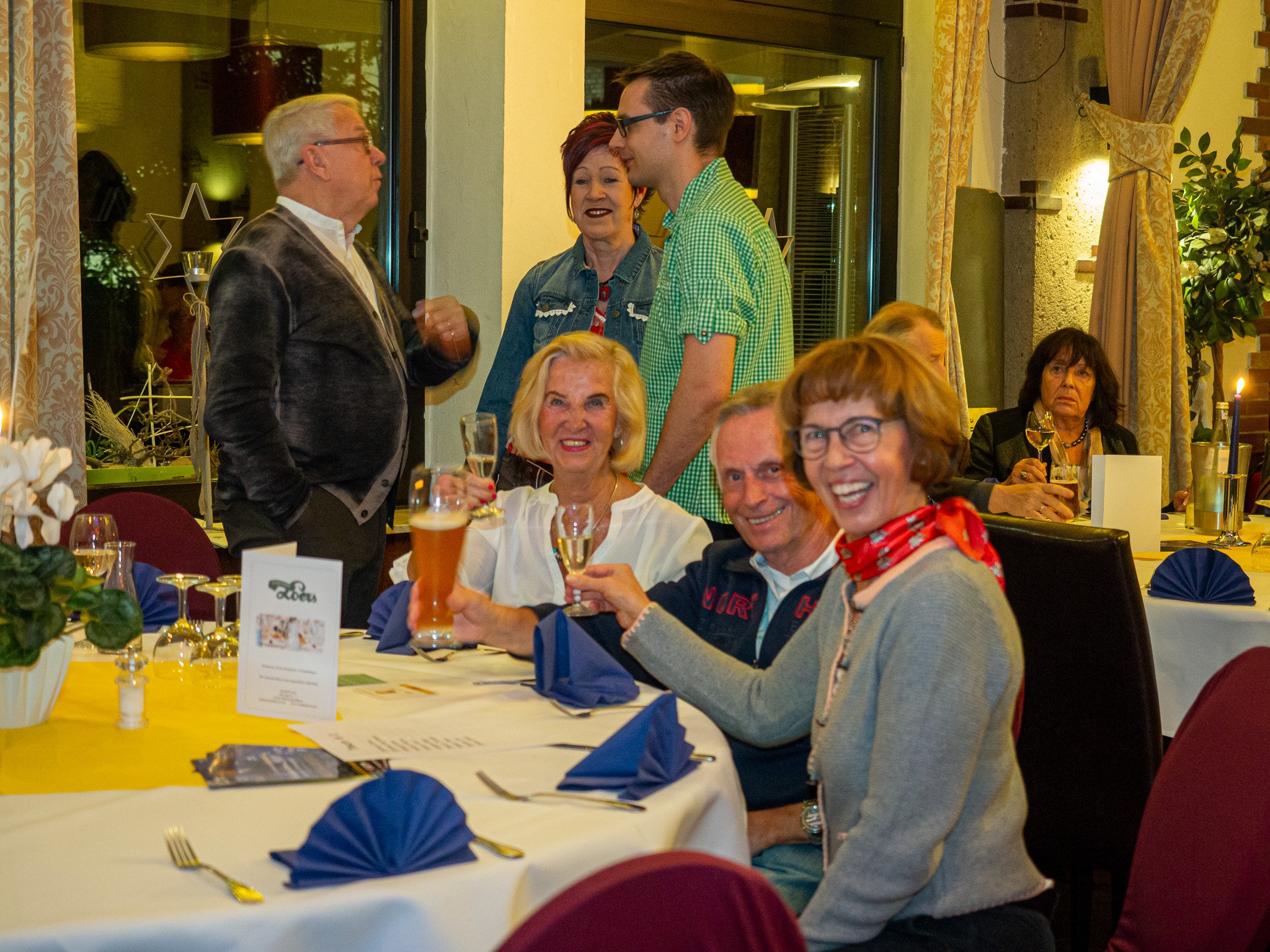 Mit dem Gasthof Loers hatten wir einen würdigen Rahmen für die bald 120 Gäste gefunden. Dort wurden wir von dem aufmerksamen Personal sehr gut betreut und mit Haxenfleisch, Leberkäse und zahlreichen Beilagen bei Kräften sowie mit alkoholischen Getränke bei Laune gehalten. Angesichts des Umstandes, dass an dem Abend auch noch eine weitere sehr große Gesellschaft zum Gänseessen in dem Lokal weilte, wirklich eine beachtenswerte Leisung des Hauses Loers.