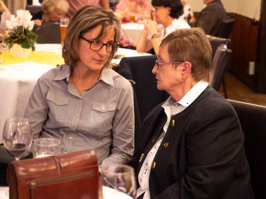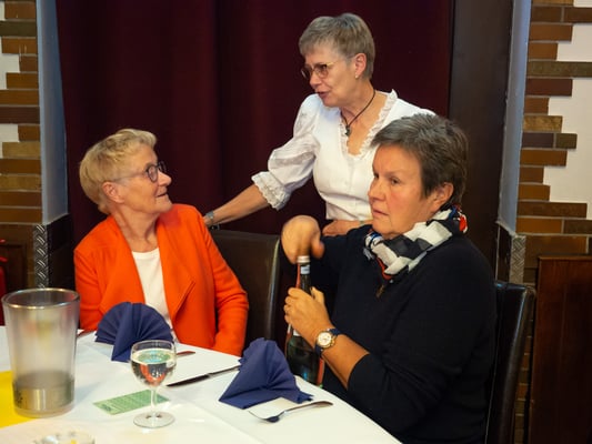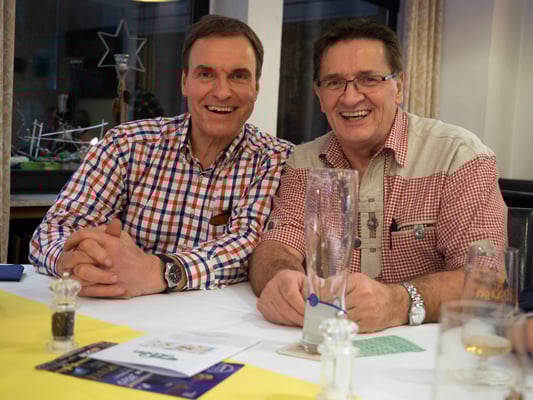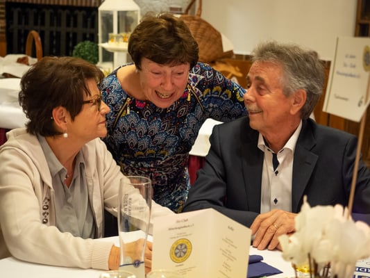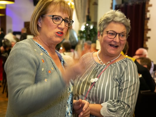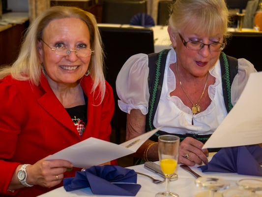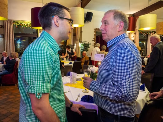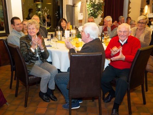 Angesichts des Durchschnittsalters unserer Mitglieder hätte ich es ahnen müssen. Der Einlass war für 19:00 Uhr vorgesehen und da dachte ich mir, ein bißchen früher da zu sein, um von den Vorbereitungen des Sektempfangs auch noch etwas im Bild festhalten zu können. Was soll man sagen, als ich kurz nach 18:30 das Lokal betrat, empfing mich von weitem schon die übliche Lautstärke einer Menschansammlung, wo alle gleichzeitig zu sprechen scheinen. Konnte das sein? War Einlass eine Stunde früher? - Jedenfalls war der Einlass zur Feier schon voll im Gange und eine beträchtliche Zahl von Gästen war schon erschienen.