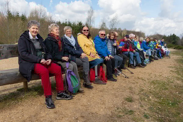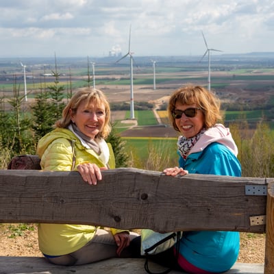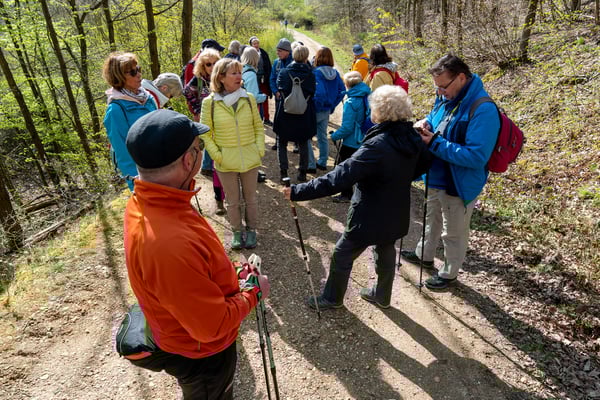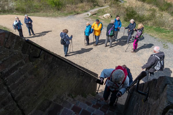 Ohne Gruppenbild sieht man sie von dannen ziehen, aber unsere Anne steuerte noch ein Bild des Chronisten bei der Arbeit bei. - Weiter ging es in vielen Kehren zu unserer ersten Rast: der langen Bank, von der wir einen schönen weiten Blick über die "Energielandschaft" hatten. Kleiner Tipp: Wem die Bilder zu klein sind, einfach mal drauf klicken, dann werden sie groß.