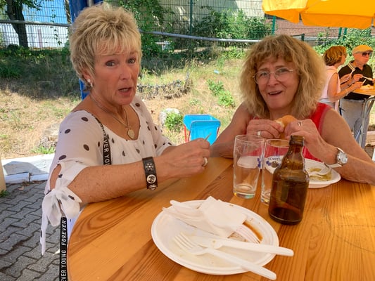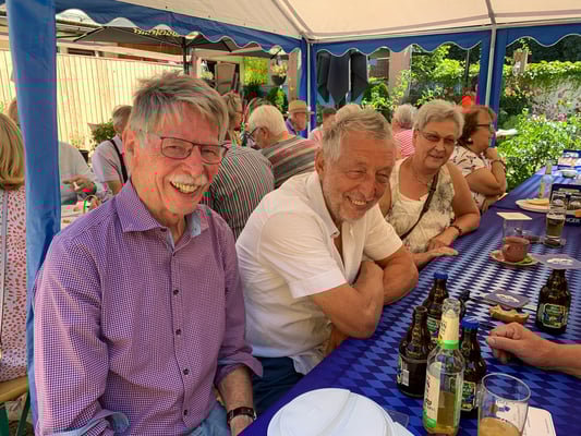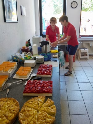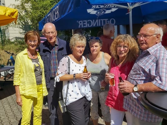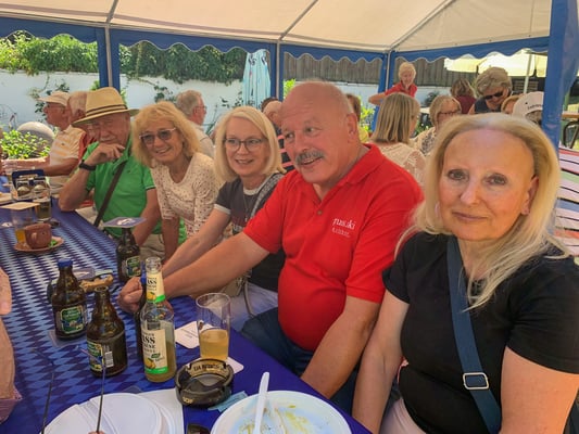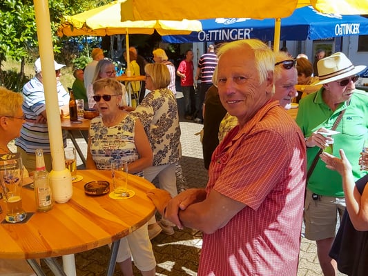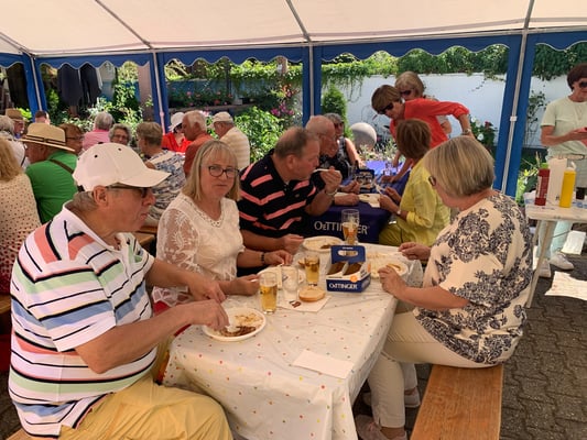 Ab 11:00 Uhr erschienen dann die ersten Gäste und das Begrüßungsteam hatte mit der Ausgabe der Verzehrmarken und Annahme der Reiseanmeldungen alle Hände voll zu tun. Insgesamt kamen 88 Mitglieder und 12 Gäste, was die 100 voll machte. Zahlreiche Reiseanmeldungen gingen ein. Dann wurde der Grill angeschmissen und die Hüter desselben begaben sich in die Hitze und sorgten dafür, dass die Würste und das Fleisch gar wurden und der Vulkan nicht ausging. Dank auch an die Mannschaft, die dafür sorgte, dass alles auf die Teller kam und hinterher mit Kaffee und Kuchen den Schmaus abrundete.
