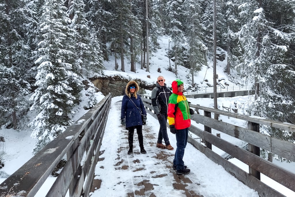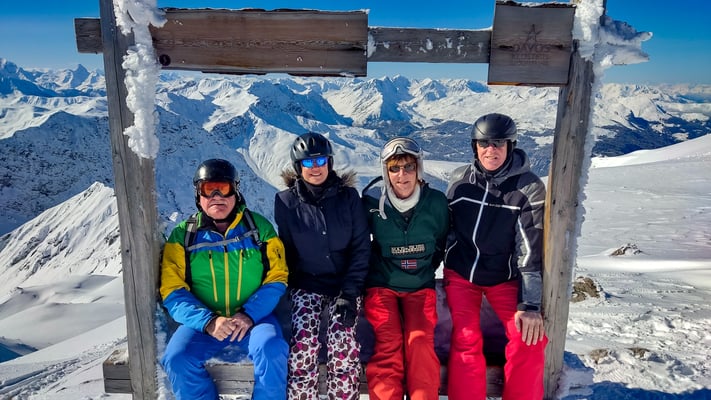 Nachdem wir am Vormittag bereits mehrfach einige Gruppen am Einstieg zur Route 13 gesehen hatten, versuchten wir es nachmittags auch, obwohl jetzt niemand mehr diese Route fuhr. Am Einstieg angekommen gab es kein Zurück mehr und die 980 Höhenmeter „freies Gelände“ zur Mühle (1.619 m) mussten bewältigt werden. Der Erste, der einen Ski verlor, war ich und das Aufstehen kostete mehr Kraft als die ganze Abfahrt. Im unteren Teil war es dann Diana, die zwischen Steinen und Baumstümpfen, von Lachanfällen überwältigt, nicht mehr auf/in ihre Ski kam. Nur Marion und Walter haben dieses Abenteuer ohne Schneekontakt überstanden. Die Stärkung in der „Mühle“ hatten wir uns wahrlich verdient und der Wirt in der Mühle (sehr geschäftstüchtig) sagte uns, wenn wir nach Davos müssten, sei der Bus gerade weg, aber in einer guten Stunde ging der letzte Bus, danach würden sie auch schließen. Nach diesem ereignisreichen Tag fuhren wir dann mit dem letzten Bus Richtung Hotel.