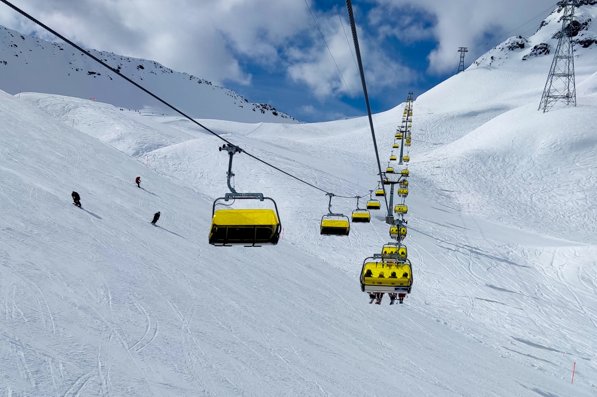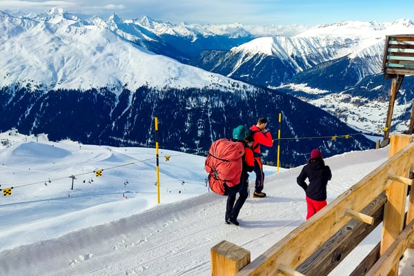 Am Folgetag nahmen wir den Skibus, der jede ¼ Stunde fährt (auch mittags), bei schönem Wetter zum Jakobshorn. Nach einer Station stiegen wir aus und gingen zu einem Fahrstuhl, der uns zum Bahnhof „Davos Platz“ brachte. Hier nahmen wir eine Unterführung der Bahngleise und erreichten die Gondel (Jakobshornbahn) mit Ausstieg an der Jschalp (1.931 m). Von hier ging es mit der 2-ten Gondel aufs Jakobshorn (2.590 m). Bis zur Mittagspause hatten wir alle Aufstiegshilfen (Lifte, Gondeln) mehrfach zur Hilfe genommen und uns eine Ruhepause auf der Jatzhütte verdient. Diese ist ein beliebter Startplatz der Paraglider. Wir konnten mehrere gelungene Starts beobachten, jedoch auch einen Absturz, da sich der Schirm nicht öffnete. Der Absturz blieb ohne Folgen, war jedoch sehr schweißtreibend für den Paraglider.