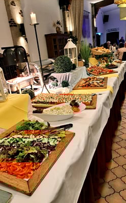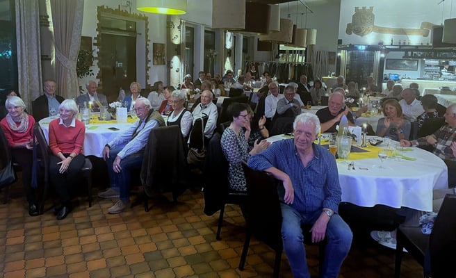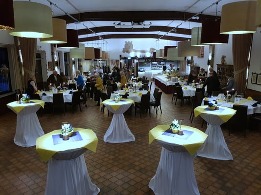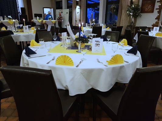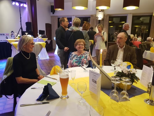 Rasch nach der Einlasszeit um 19 Uhr waren die 80 gut gelaunten Teilnehmer fast vollständig eingetroffen, freuten sich über den Sektempfang und fanden an den hübsch geschmückten Tischen ihre Plätze. Der erste Höhepunkt war das vielseitige kalt-warme Buffet, das großen Anklang fand.