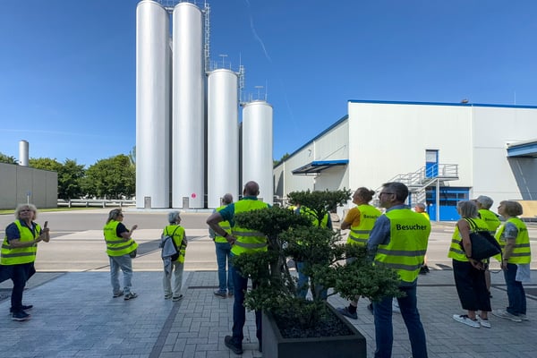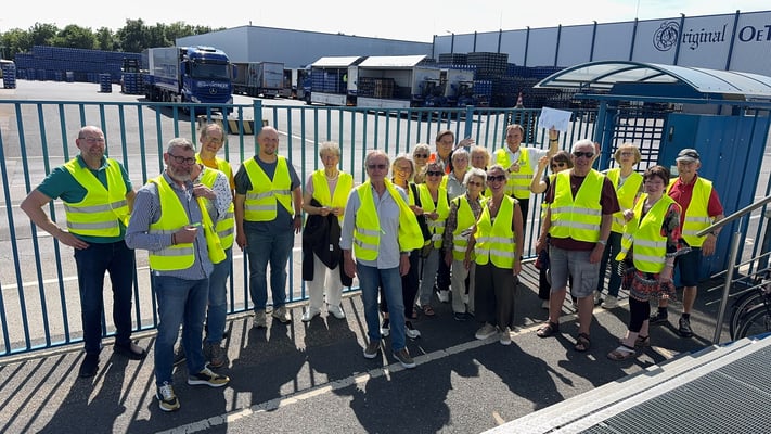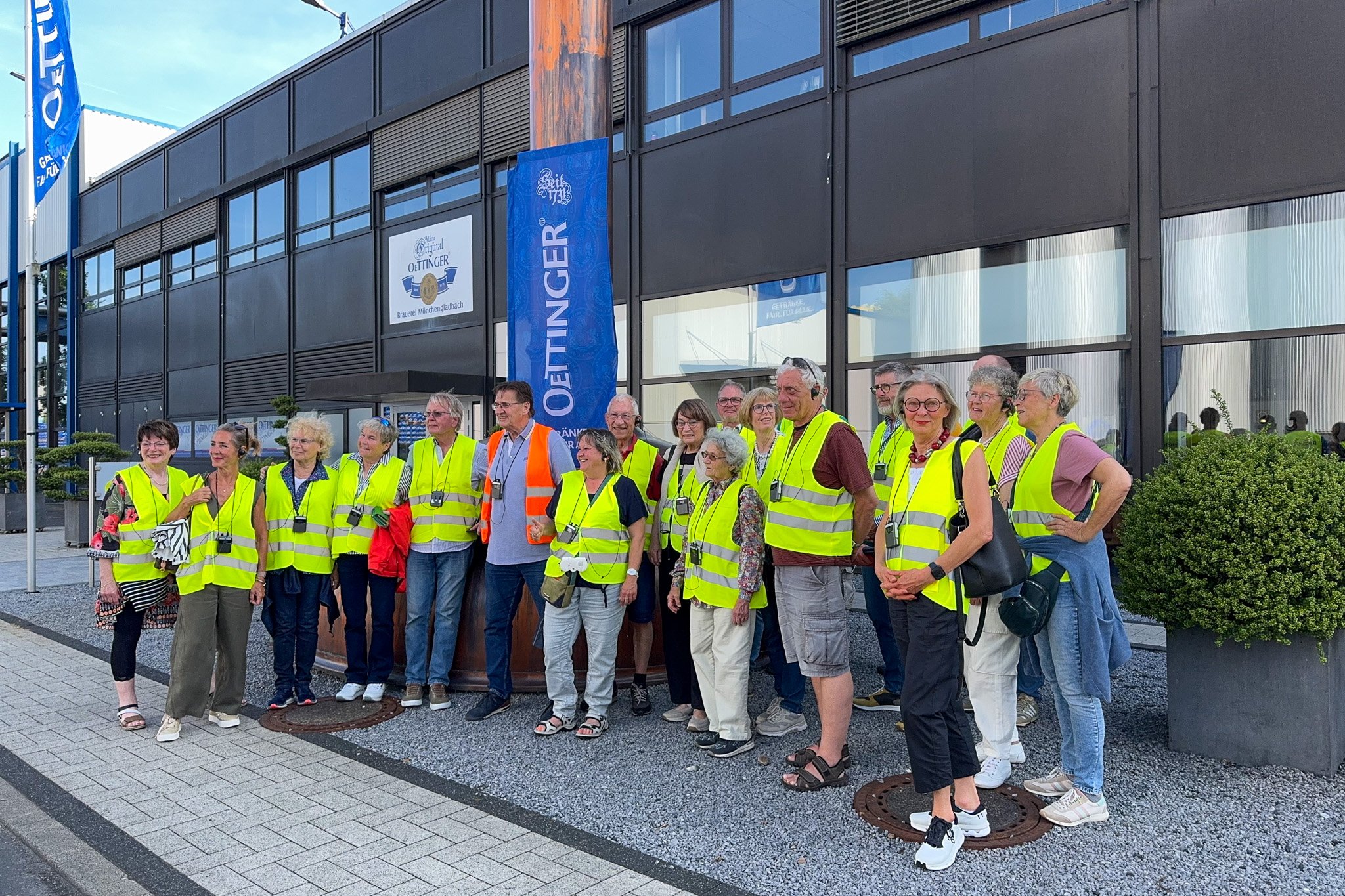 Hier vor dem Eingang zur Besucherstube einmal mehr Aufstellung zum Gruppenbild. Innen war es herrlich kühl, ein leichter Luftzug wehte durch den Raum und wir alle bestaunten den reichlich gedeckten Tisch mit den unterschiedlichsten Spezialitäten, die Oettinger in Mönchengladbach herstellt. Nach den ersten Einführungsworten draußen in der Hitze war es ein Labsal für die Kehlen, die kalten Flaschen zu öffnen und die ersten Schlucke zu nehmen. Wie das zischte!