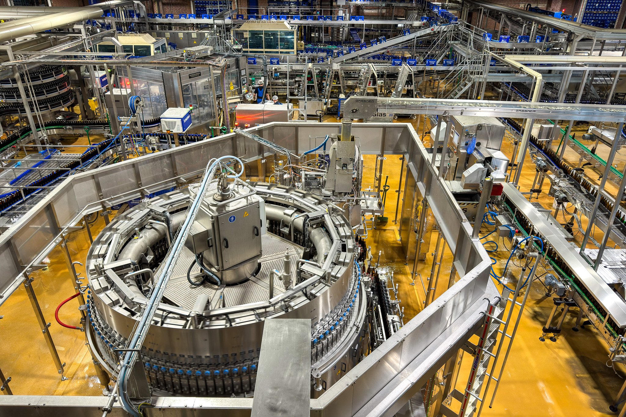 Die vorstehende sich schnell drehende Maschine ist für die Flaschenbefüllung zuständig. Durch Gegendruck wird das Aufschäumen des Biers verhindert und bevor die Flasche die Maschine verlässt ist der Kronkorken schon drauf. Jeder blaue Punkt auf dem Rondell steht für eine Flasche. Und ich hatte den Eindruck, dass es nur 4 bis 5 Sekunden dauerte, bis sich diese Maschine einmal um die eigene Achse gedreht hatte und geschätzt Bier für 8 bis 10 Kästen abfüllte.