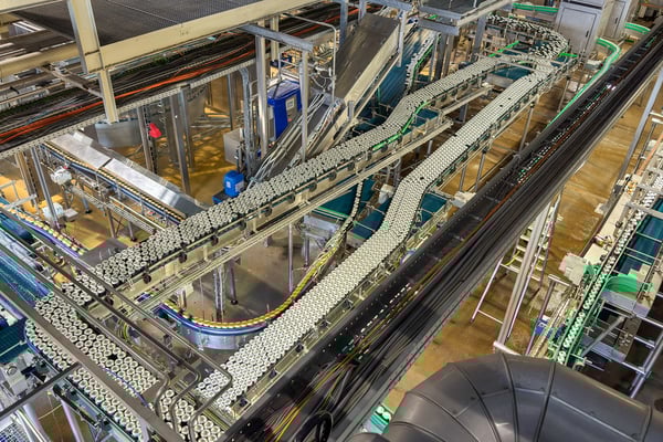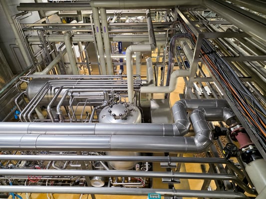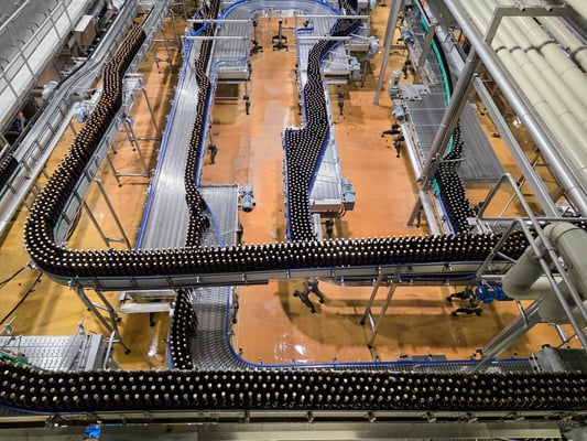 In großen Leitungen kommt das Bier zur Befüllung der Flaschen und Büchsen an. Übrigens über Pipelines aus den großen Silos, die wir schon gesehen haben auf der im Werksgelände gegenüberliegenden Seite der Abfüllanlagen.