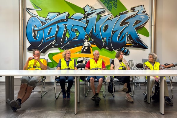 Vor dem Einlass hieß es erstmal uns als Besucher zu identifizieren. Alle bekamen gelbe Jacken und Toni, als Initiator eine orange. Es war unglaublich heiß an diesem Tag und es war nicht ganz klar was größer war, der Durst oder die Neugier.