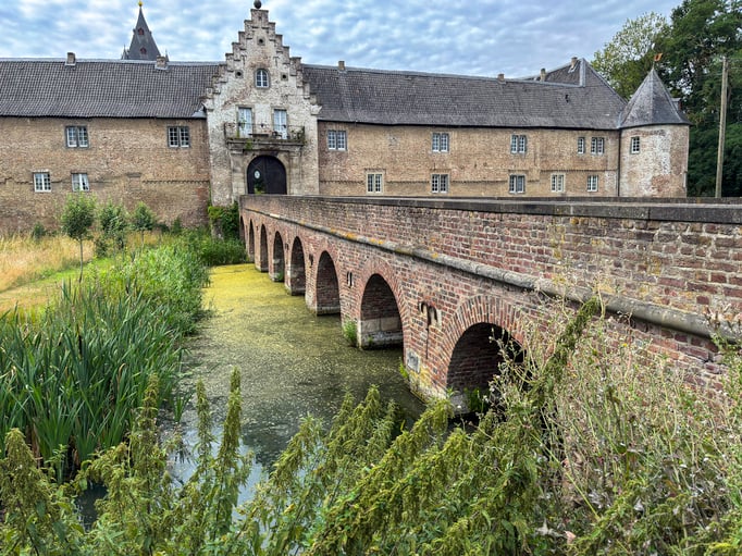 Der dann folgenden Streckenabschnitt (wohl einer der schönsten auf der Tour) wechselte ab mit Blicken auf die Erft, Waldwegen und am Ende dem Schloss Hülchrath. Leider kann man es nicht mehr besichtigen, da überall Schilder mit dem Hinweis auf PRIVAT stehen. Im Kontrast dazu bietet sich dann aber ein ziemlich ungepflegter Eindruck dieser Anlage. Die "Blauköppe" der Zufahrt waren fast ganz mit Gras zugewachsen und auch sonst wirkte alles ziemlich verwildert. Keine schöne Entwicklung, denn dieses Schloss machte schon was her.