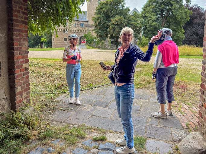 Vom Schloss Hülchrath war es dann nur noch ein kurzes Stück bis zu unserem Ziel, dem Kloster Langwaden. Zur Anfahrt ging es dann nicht über die Straße, sondern auf einem verwunschenen Pfad den Gilbach entlang, der geradewegs auf dem Klosterhof endete wo wir auf der Terasse alle Platz fanden.